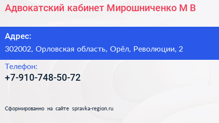 Адвокатский кабинет Мирошниченко М.В. по адресу 302002, Орловская область, Орёл, Революции, 2 в дальнейшем Организация, размещена в следующих категориях: