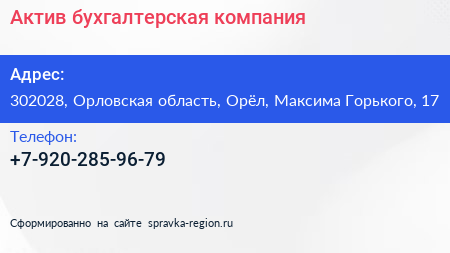 Актив, бухгалтерская компания по адресу 302028, Орловская область, Орёл, Максима Горького, 17 в дальнейшем Организация, размещена в следующих категориях: