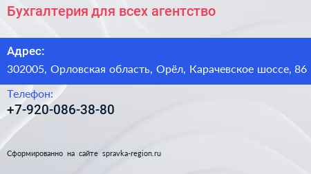 Бухгалтерия для всех, агентство по адресу 302005, Орловская область, Орёл, Карачевское шоссе, 86 в дальнейшем Организация, размещена в следующих категориях: