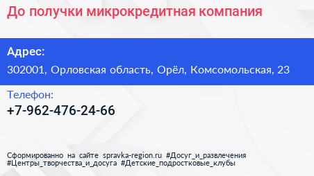 До получки, микрокредитная компания по адресу 302001, Орловская область, Орёл, Комсомольская, 23 в дальнейшем Организация, размещена в следующих категориях:
