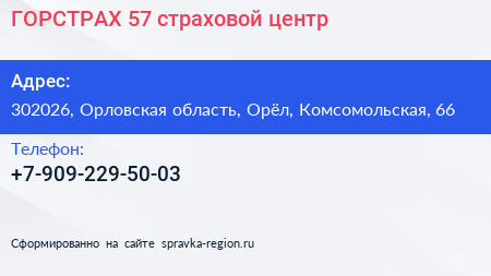 ГОРСТРАХ 57, страховой центр по адресу 302026, Орловская область, Орёл, Комсомольская, 66 в дальнейшем Организация, размещена в следующих категориях: