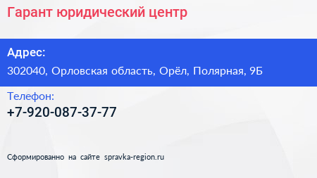 Гарант, юридический центр по адресу 302040, Орловская область, Орёл, Полярная, 9Б в дальнейшем Организация, размещена в следующих категориях: