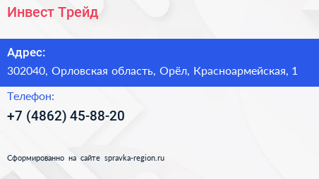 Инвест Трейд по адресу 302040, Орловская область, Орёл, Красноармейская, 1 в дальнейшем Организация, размещена в следующих категориях: