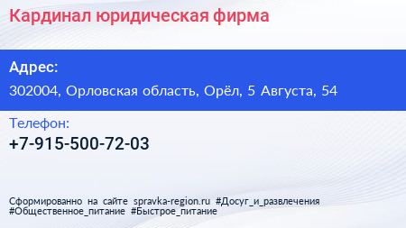 Кардинал, юридическая фирма по адресу 302004, Орловская область, Орёл, 5 Августа, 54 в дальнейшем Организация, размещена в следующих категориях: