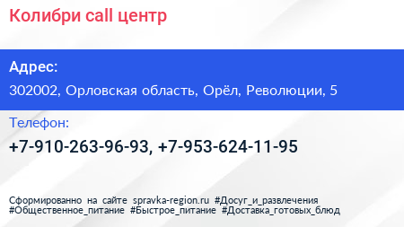 Колибри, call-центр по адресу 302002, Орловская область, Орёл, Революции, 5 в дальнейшем Организация, размещена в следующих категориях: