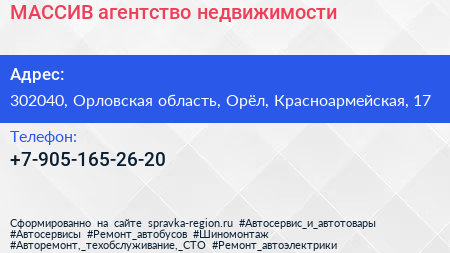 МАССИВ, агентство недвижимости по адресу 302040, Орловская область, Орёл, Красноармейская, 17 в дальнейшем Организация, размещена в следующих категориях: