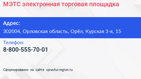 МЭТС, электронная торговая площадка по адресу 302004, Орловская область, Орёл, Курская 3-я, 15 в дальнейшем Организация, размещена в следующих категориях: