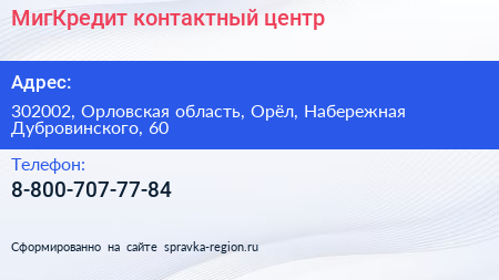 МигКредит, контактный центр по адресу 302002, Орловская область, Орёл, Набережная Дубровинского, 60 в дальнейшем Организация, размещена в следующих категориях:
