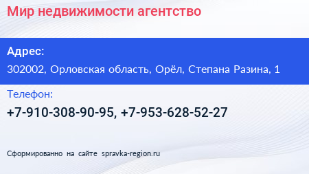 Мир недвижимости, агентство по адресу 302002, Орловская область, Орёл, Степана Разина, 1 в дальнейшем Организация, размещена в следующих категориях: