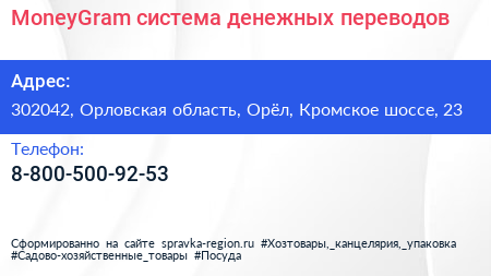MoneyGram, система денежных переводов по адресу 302042, Орловская область, Орёл, Кромское шоссе, 23 в дальнейшем Организация, размещена в следующих категориях: