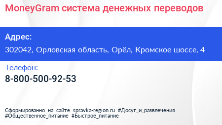 MoneyGram, система денежных переводов по адресу 302042, Орловская область, Орёл, Кромское шоссе, 4 в дальнейшем Организация, размещена в следующих категориях: