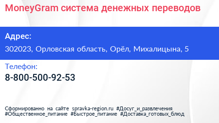 MoneyGram, система денежных переводов по адресу 302023, Орловская область, Орёл, Михалицына, 5 в дальнейшем Организация, размещена в следующих категориях: