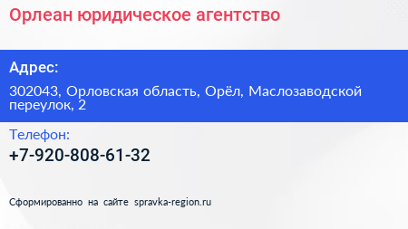 Орлеан, юридическое агентство по адресу 302043, Орловская область, Орёл, Маслозаводской переулок, 2 в дальнейшем Организация, размещена в следующих категориях: