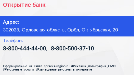 Открытие, банк по адресу 302028, Орловская область, Орёл, Октябрьская, 20 в дальнейшем Организация, размещена в следующих категориях: