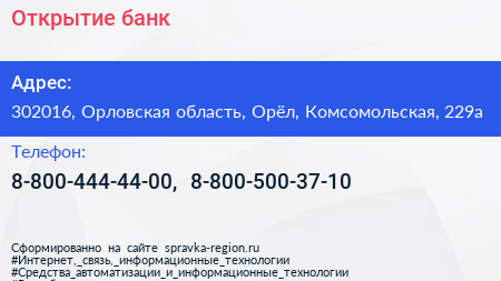 Открытие, банк по адресу 302016, Орловская область, Орёл, Комсомольская, 229а в дальнейшем Организация, размещена в следующих категориях: