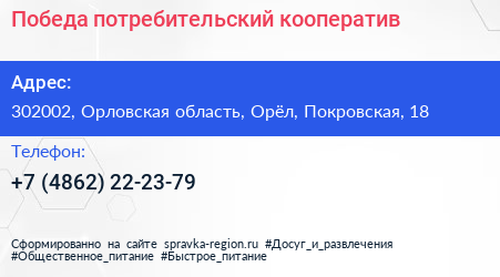 Победа, потребительский кооператив по адресу 302002, Орловская область, Орёл, Покровская, 18 в дальнейшем Организация, размещена в следующих категориях: