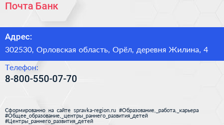 Почта Банк по адресу 302530, Орловская область, Орёл, деревня Жилина, 4 в дальнейшем Организация, размещена в следующих категориях: