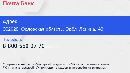 Почта Банк по адресу 302028, Орловская область, Орёл, Ленина, 43 в дальнейшем Организация, размещена в следующих категориях: