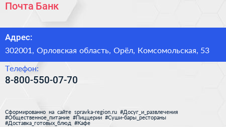 Почта Банк по адресу 302001, Орловская область, Орёл, Комсомольская, 53 в дальнейшем Организация, размещена в следующих категориях: