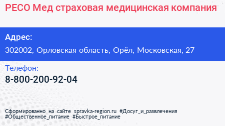 РЕСО-Мед, страховая медицинская компания по адресу 302002, Орловская область, Орёл, Московская, 27 в дальнейшем Организация, размещена в следующих категориях: