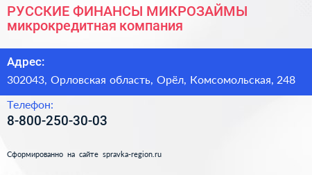 РУССКИЕ ФИНАНСЫ МИКРОЗАЙМЫ, микрокредитная компания по адресу 302043, Орловская область, Орёл, Комсомольская, 248 в дальнейшем Организация, размещена в следующих категориях: