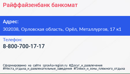 Райффайзенбанк, банкомат по адресу 302038, Орловская область, Орёл, Металлургов, 17 к1 в дальнейшем Организация, размещена в следующих категориях: