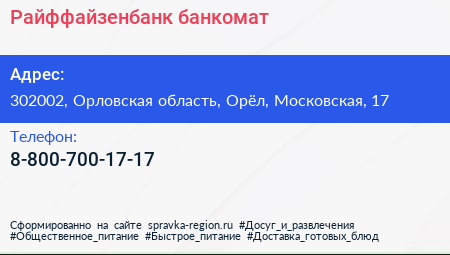 Райффайзенбанк, банкомат по адресу 302002, Орловская область, Орёл, Московская, 17 в дальнейшем Организация, размещена в следующих категориях: