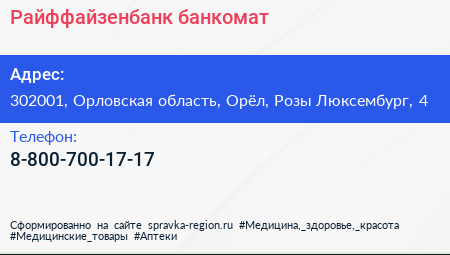 Райффайзенбанк, банкомат по адресу 302001, Орловская область, Орёл, Розы Люксембург, 4 в дальнейшем Организация, размещена в следующих категориях: