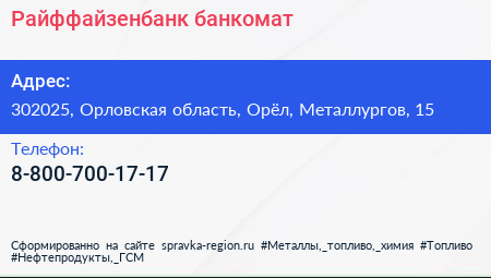 Райффайзенбанк, банкомат по адресу 302025, Орловская область, Орёл, Металлургов, 15 в дальнейшем Организация, размещена в следующих категориях: