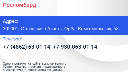 Росломбард по адресу 302001, Орловская область, Орёл, Комсомольская, 53 в дальнейшем Организация, размещена в следующих категориях: