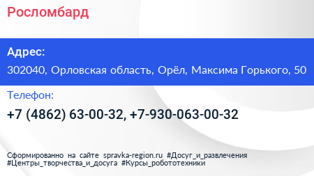 Росломбард по адресу 302040, Орловская область, Орёл, Максима Горького, 50 в дальнейшем Организация, размещена в следующих категориях:
