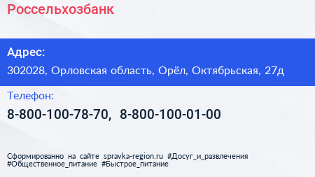 Россельхозбанк по адресу 302028, Орловская область, Орёл, Октябрьская, 27д в дальнейшем Организация, размещена в следующих категориях: