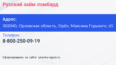 Русский займ, ломбард по адресу 302040, Орловская область, Орёл, Максима Горького, 65 в дальнейшем Организация, размещена в следующих категориях: