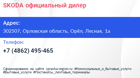 SKODA, официальный дилер по адресу 302507, Орловская область, Орёл, Лесная, 1а в дальнейшем Организация, размещена в следующих категориях: