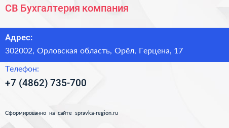 СВ-Бухгалтерия, компания по адресу 302002, Орловская область, Орёл, Герцена, 17 в дальнейшем Организация, размещена в следующих категориях: