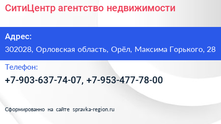 СитиЦентр, агентство недвижимости по адресу 302028, Орловская область, Орёл, Максима Горького, 28 в дальнейшем Организация, размещена в следующих категориях: