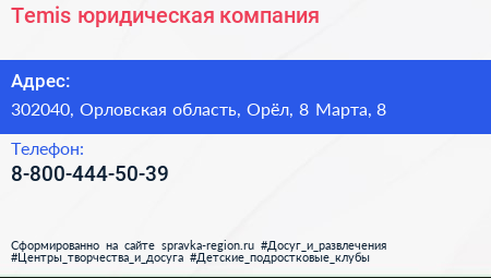 Temis, юридическая компания по адресу 302040, Орловская область, Орёл, 8 Марта, 8 в дальнейшем Организация, размещена в следующих категориях: