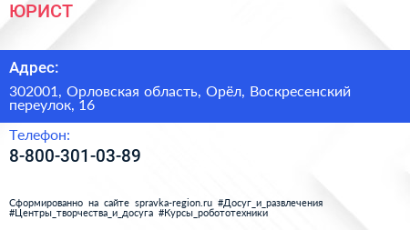 ЮРИСТ по адресу 302001, Орловская область, Орёл, Воскресенский переулок, 16 в дальнейшем Организация, размещена в следующих категориях: