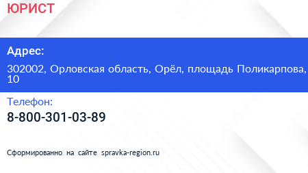 ЮРИСТ по адресу 302002, Орловская область, Орёл, площадь Поликарпова, 10 в дальнейшем Организация, размещена в следующих категориях: