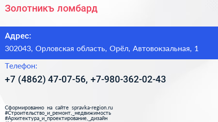 Золотникъ, ломбард по адресу 302043, Орловская область, Орёл, Автовокзальная, 1 в дальнейшем Организация, размещена в следующих категориях: