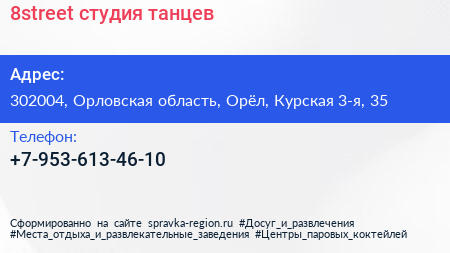 8street, студия танцев по адресу 302004, Орловская область, Орёл, Курская 3-я, 35 в дальнейшем Организация, размещена в следующих категориях: