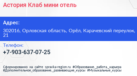 Астория Клаб, мини-отель по адресу 302016, Орловская область, Орёл, Карачевский переулок, 21 в дальнейшем Организация, размещена в следующих категориях:
