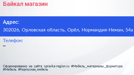 Байкал, магазин по адресу 302026, Орловская область, Орёл, Нормандия-Неман, 54а в дальнейшем Организация, размещена в следующих категориях: