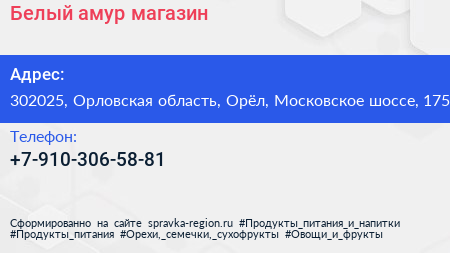 Белый амур, магазин по адресу 302025, Орловская область, Орёл, Московское шоссе, 175 в дальнейшем Организация, размещена в следующих категориях: