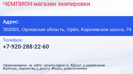 ЧЕМПИОН, магазин экипировки по адресу 302005, Орловская область, Орёл, Карачевское шоссе, 74 в дальнейшем Организация, размещена в следующих категориях: