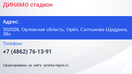 ДИНАМО, стадион по адресу 302028, Орловская область, Орёл, Салтыкова-Щедрина, 38а в дальнейшем Организация, размещена в следующих категориях: