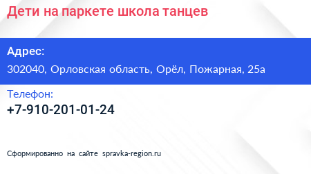 Дети на паркете, школа танцев по адресу 302040, Орловская область, Орёл, Пожарная, 25а в дальнейшем Организация, размещена в следующих категориях: