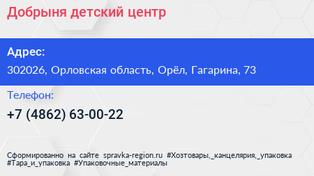 Добрыня, детский центр по адресу 302026, Орловская область, Орёл, Гагарина, 73 в дальнейшем Организация, размещена в следующих категориях: