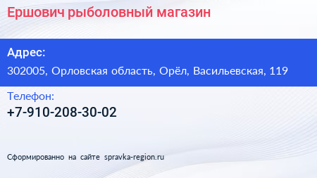 Ершович, рыболовный магазин по адресу 302005, Орловская область, Орёл, Васильевская, 119 в дальнейшем Организация, размещена в следующих категориях:
