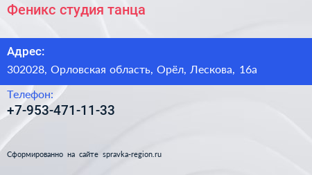 Феникс, студия танца по адресу 302028, Орловская область, Орёл, Лескова, 16а в дальнейшем Организация, размещена в следующих категориях: